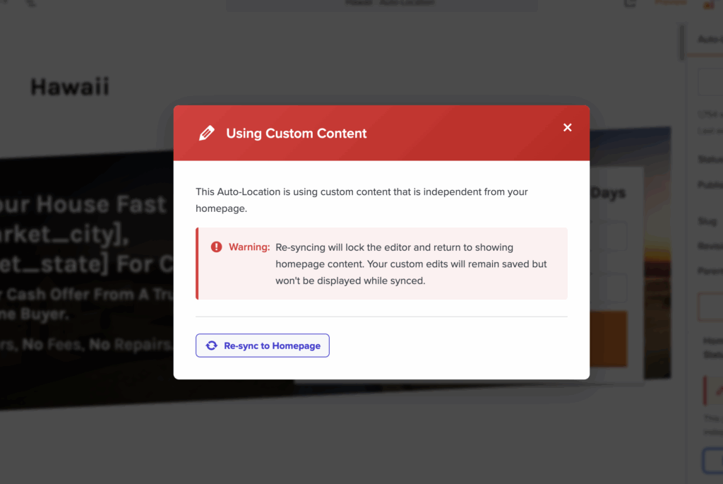 If you want to customize your Synced Auto-Location Page, first directly edit the page in question and then navigate to the “Auto-Location Page” sidebar tab on the right hand side of the Editor view. Under the Homepage Sync Status you will see if your page is Using Custom Content or Synced to the Homepage–by clicking “Manage Sync Settings”, you can make the content editable OR Re-sync to the Homepage.