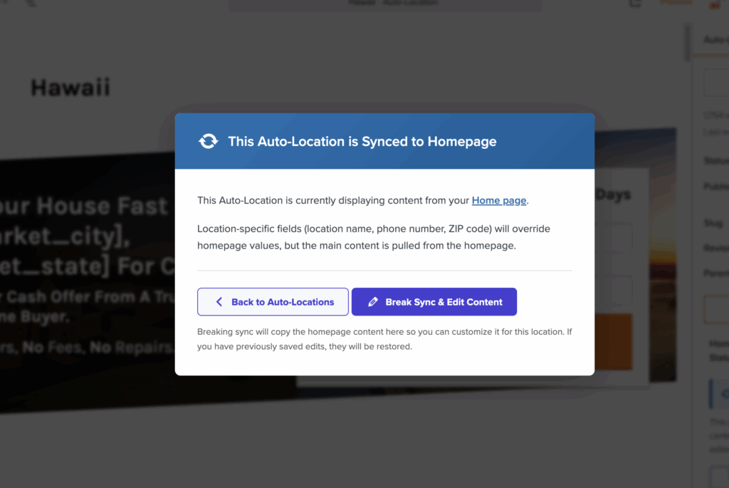 While synced Auto-Location pages save time by automatically updating when your homepage changes, you now have the option to break sync and customize any Auto-Location page. This gives you the flexibility to make specific pages unique when needed, without having to manually create and maintain separate pages.