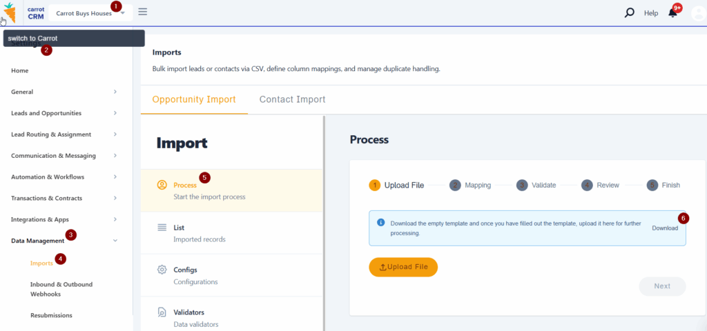 Opportunity Import is how you upload your leads into Carrot CRM in bulk by downloading our import template and transferring data from your spreadsheet into the template file, and upload it into Carrot CRM.