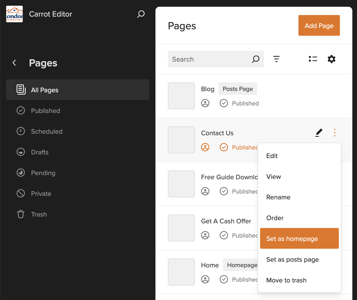 Step 3: Once all your pages have loaded, locate the page you want to set as your homepage.