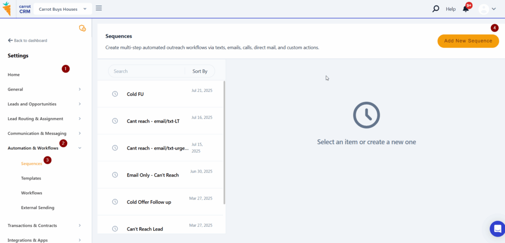 Carrot CRM’s automated outreach sequences make sure no lead gets left behind. Sequences are a group of automated messages that are sent out to your leads on a timed basis and can be customized depending on how you want to follow up with the seller.