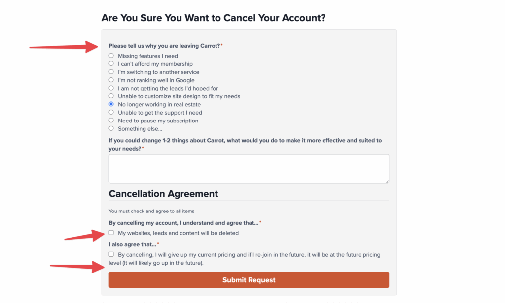 B) You’ll then be given options for your cancellation reason, and a “Submit Request” button. Once that’s clicked, your account immediately stops any future billing. Your account will remain open until the end of your payment period. Please note, that requesting to cancel the account will not stop open invoices from processing. Please contact support if you need to discuss an open invoice. If you are within your 30 days, there are no further steps to take to receive a refund. This will be processed automatically. Once you click “Submit Request“, you are done!