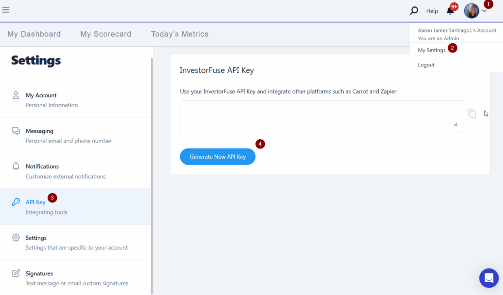 🚨 IMPORTANT: Generate an API key only if this is your first time integrating to your InvestorFuse Market Space. The authentication of the API key should remain on your Zapier account and should be used on any integration moving forward. Generating a new API key, while the current API key is in use may disable previous integrations.